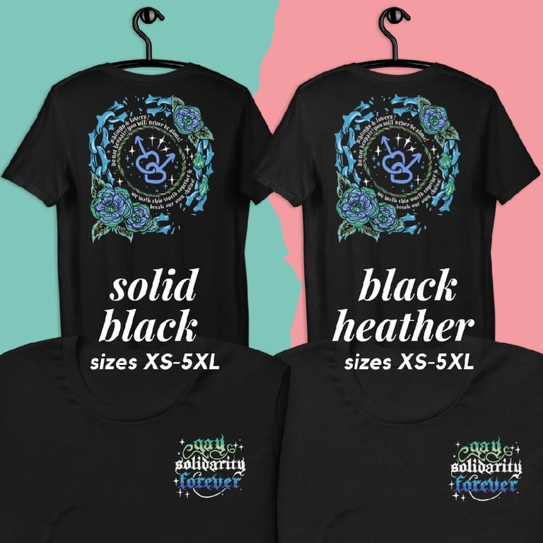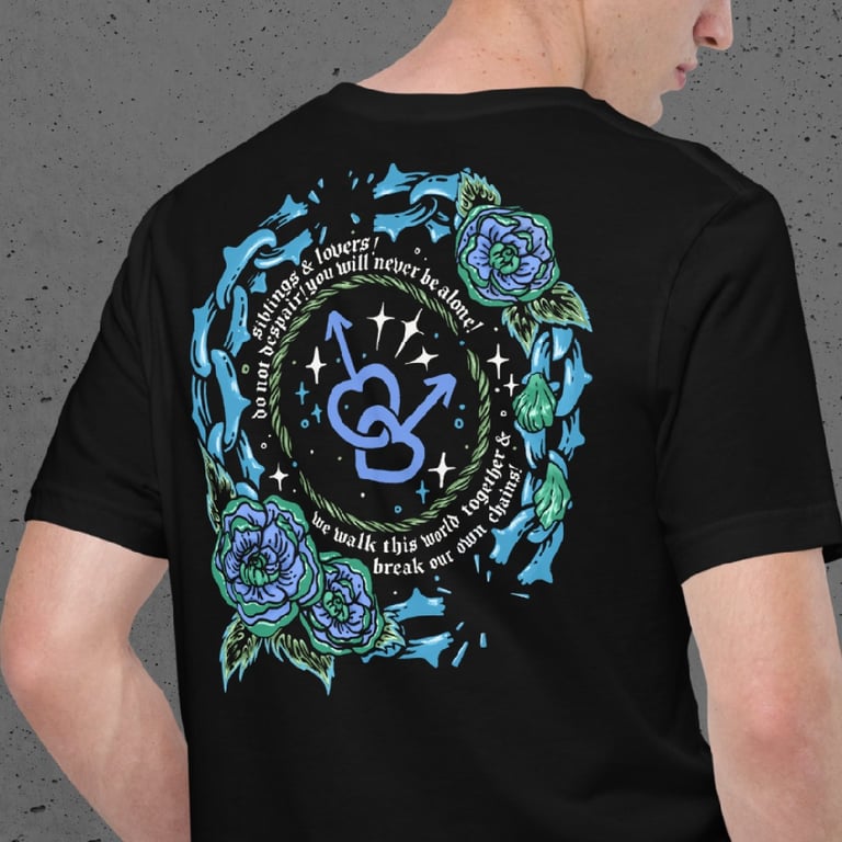 This double printed tee features both a pocket chest print that reads "gay solidarity forever" in the lesbian pride flag colours as well as a large, vibrant back print. The back print reads "siblings & lovers! do not despair! you will never be alone! we walk this world together & break our own chains!", and features an image of interlocking male symbols.