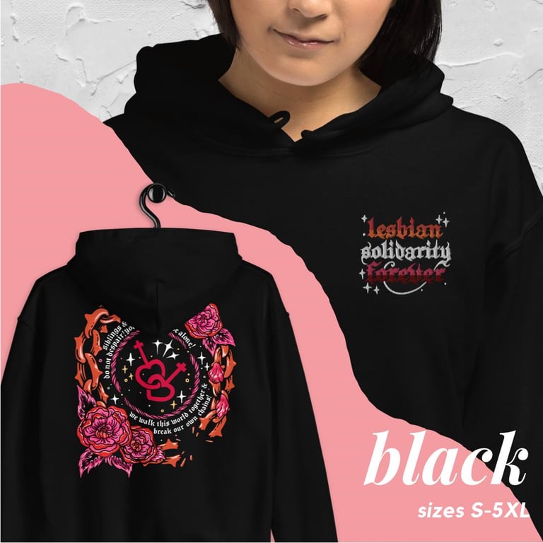 This heavyblend hoodie makes the perfect go-to hoodie to curl up in, and features both an embroidered chest design that reads "lesbian solidarity forever" in the lesbian pride flag colours as well as a large, vibrant back print. The back print reads "siblings & lovers! do not despair! you will never be alone! we walk this world together & break our own chains!", and features an image of interlocking female symbols.