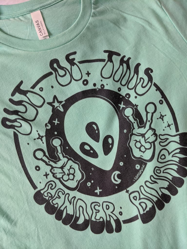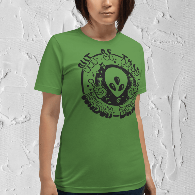 This tee features a strong print design of a peace-signing alien thats “Out of This Gender Binary”! Available in sizes XS-5XL and a range of colour finishes including; solid black, black heather, dark green, mint green, white.