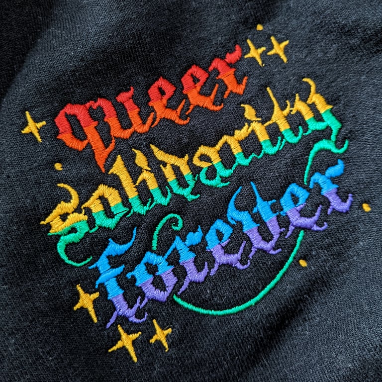 This heavyblend hoodie makes the perfect go-to hoodie to curl up in, and features both an embroidered chest design that reads "queer solidarity forever" in the rainbow pride flag colours as well as a large, vibrant back print. The back print reads "siblings & lovers! do not despair! you will never be alone! we walk this world together & break our own chains!", and features an image of interlocking transgender, genderqueer, male and female symbols.