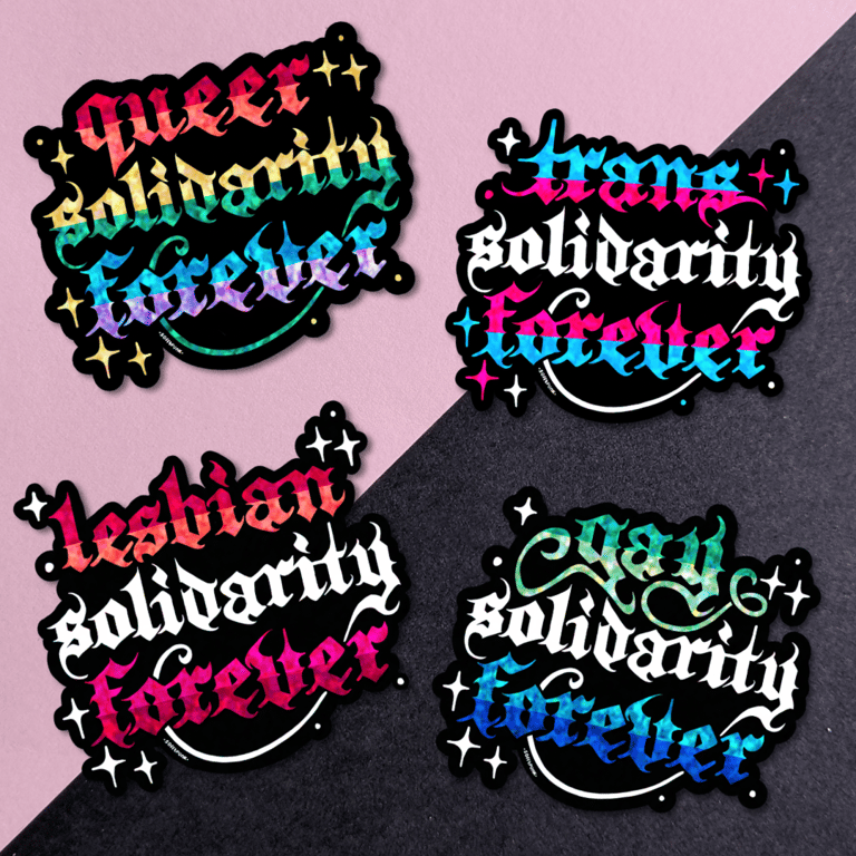 Our widely popular Solidarity Forever design is finally here in glitter sticker form! 6cm in height and dazzling, these pride flag stickers are eye catching and vibrant!