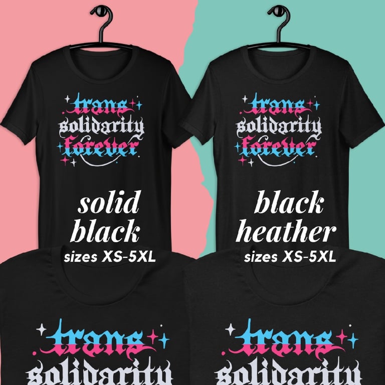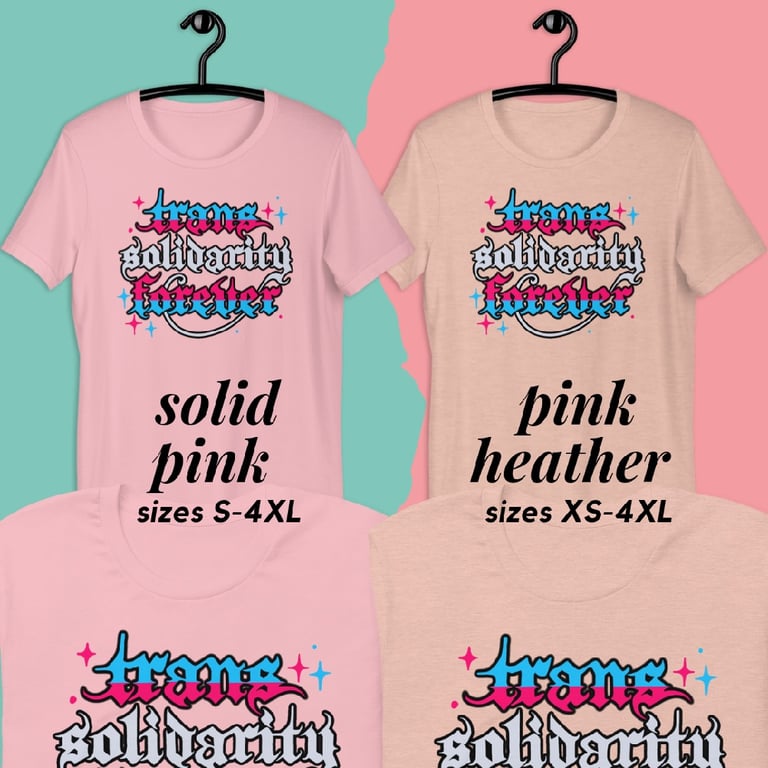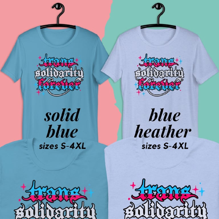 This printed tee features both a bold chest print that reads "trans solidarity forever" in the trans pride flag colours.